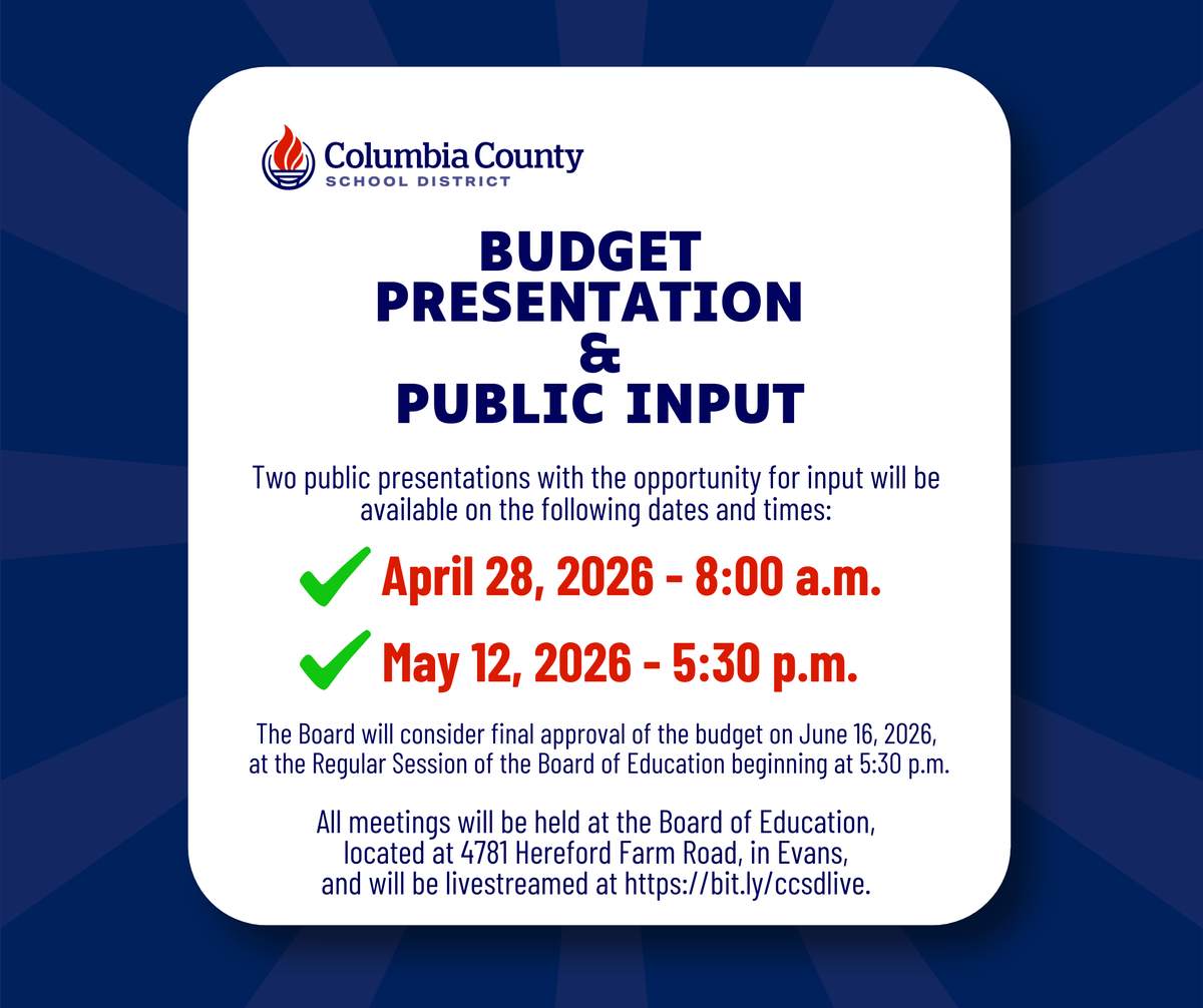- Tuesday, April 28, 2026 – 8:00 a.m. Budget Presentation and Public Input