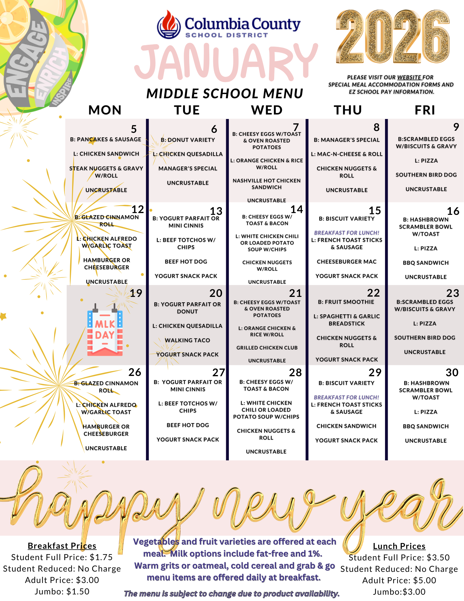 SY 2526 January Middle School Menu