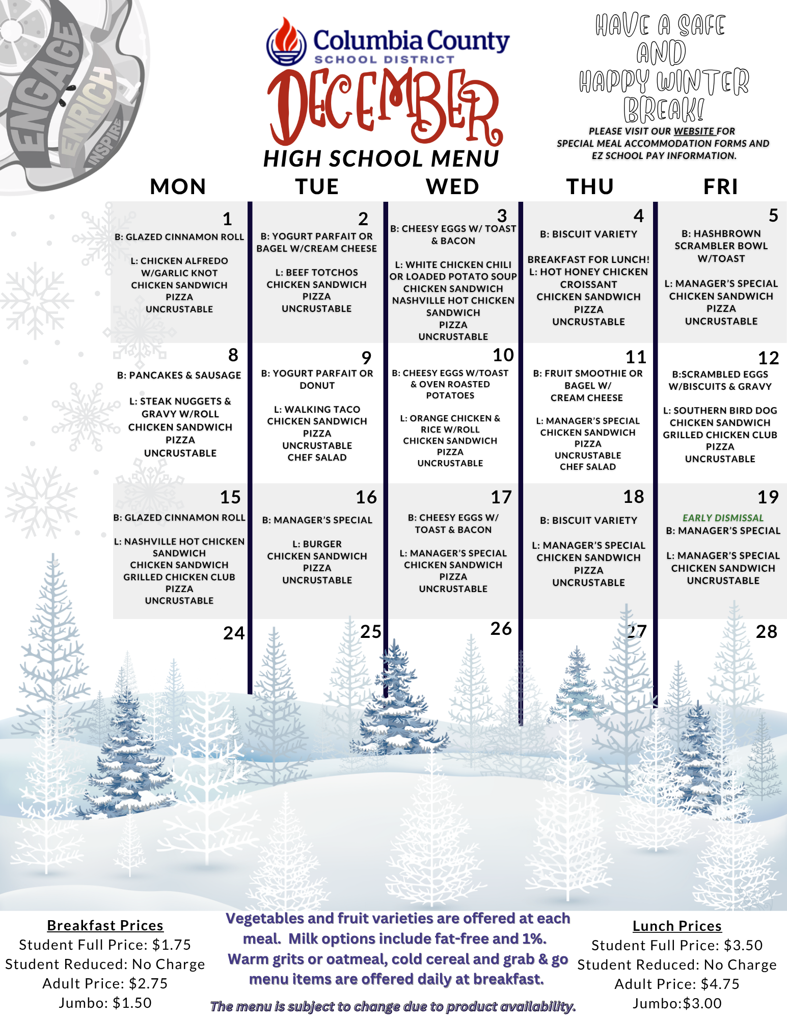 SY 2526 December High School Menu