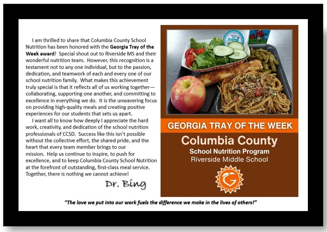 The safety and health of our students and employees is a top priority for the Columbia County School Nutrition Program. We follow strict food safety practices in our kitchens. All of our School Nutrition Managers are ServSafe certified and every staff member receives monthly as well as in-depth annual food safety and sanitation training. We currently have an average of a 100-A sanitation scores on all health inspections which are conducted at least twice a year.